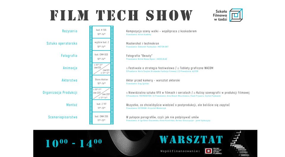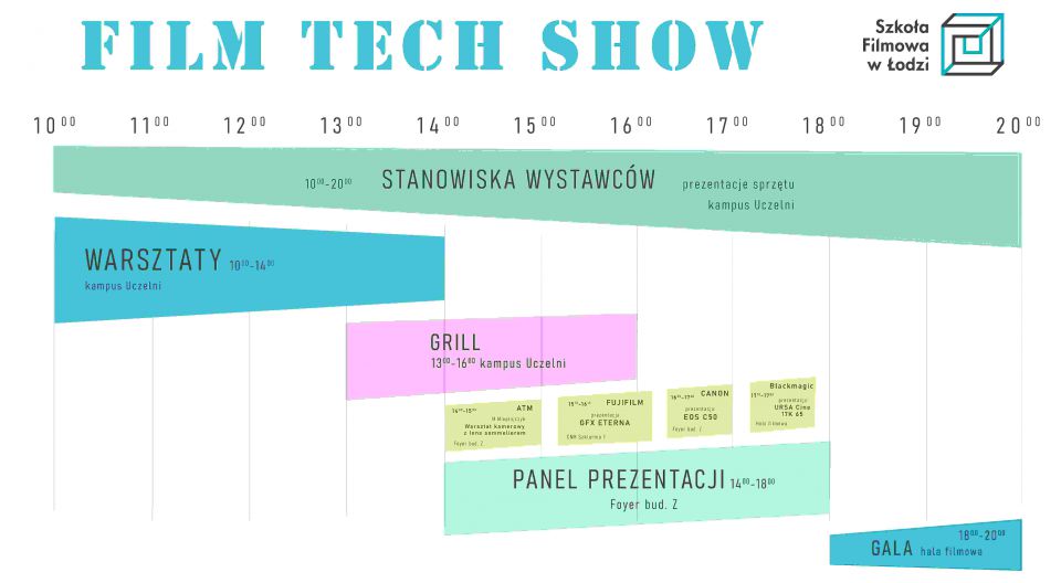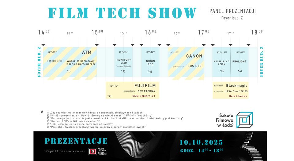 FILM TECH SHOW, który odbędzie się w piątek 10 października na terenie kampusu Szkoły Filmowej w Łodzi, to wydarzenie, którego celem jest branżowy networking oraz zapoznanie się z najnowszym sprzętem, technologiami oraz trendami panującymi w świecie profesjonalnej produkcji filmowej. Do udziału w wydarzeniu zapraszamy studentów, absolwentów, wykładowców oraz pracowników naszej Szkoły a także delegacje szkół artystycznych.