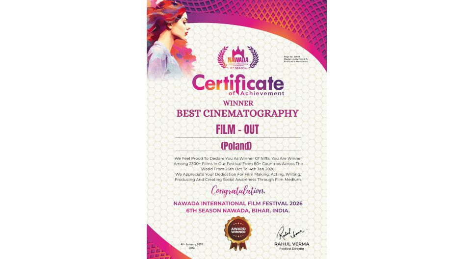 Etiuda operatorska Mateusza Gołębiewskiego otrzymała nagrodę za zdjęcia na Międzynarodowym Festiwalu Filmowym NAWADA w Indiach!